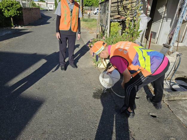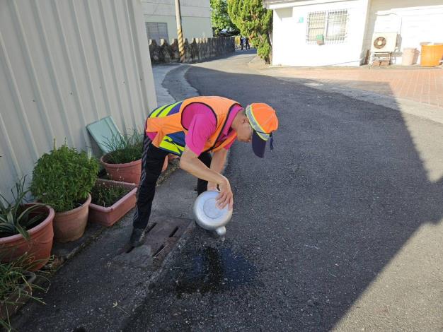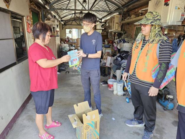 劉主任秘書志琮 感謝環保義工隊丹娜絲颱風後大家自主協助里內進行環境清潔復原打掃,也請大家如有拆下的石綿瓦和磚瓦務必做好分類,可向市府環保局登記石綿瓦之清運,磚瓦可向里長及公所登記清運,以上以外之廢棄物則請洽詢清潔隊,大家重建家園的同時也請大家繼續落實「巡 、倒 、清 、刷 」, 主動巡查自家戶內外積水容器,並再次提醒大家4月1日起若查獲登革熱孳生源者,一律依傳染病防治法開罰3,000元到1萬5,000元,無改善期,天溝、屋後溝及空地菜園等更要注意,避免積水孳生孑孓病媒蚊,請大家一起做好登革熱防治工作 ,打造無蚊家園!外出時穿著淺色長袖衣褲,並使用防蚊液保護自身安全。!