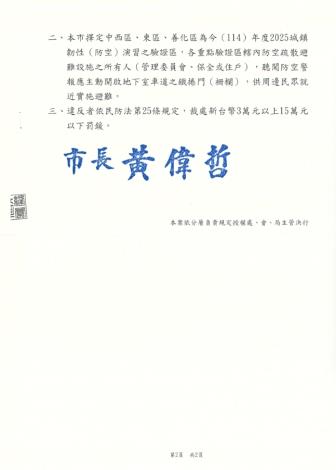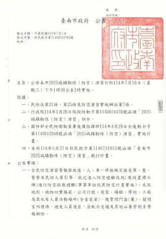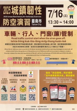 各位七股鄉親大家平安:2025城鎮韌性(防空)演習南部地區(臺南市、高雄市、屏東縣)114年7月16日(星期三)13時30分至14時演習期間將實施:車輛、行人管制門窗(簾)關閉管制聽聞防空警報或接獲手機告警訊息時,請依 警察及 民防人員引導,就近實施疏散避難。未配合演習管制及演練者,將依民防法處 新臺幣3萬元以上、15萬元以下罰鍰資源連結:各場域防空疏散避難指引:https://reurl.cc/8Drgb4警察局防空避難專區:https://reurl.cc/xNYrKz警政服務APP:https://reurl.cc/NY572e消防防災E點通APP:https://reurl.cc/kn4z9r同時將透過「空中威脅告警系統」發送簡訊通知視障朋友請開啟:手機talkback(Android)、voiceover(iOS)語音功能Be My Eyes 請求協助 行動不便者請提早或請人協助避難