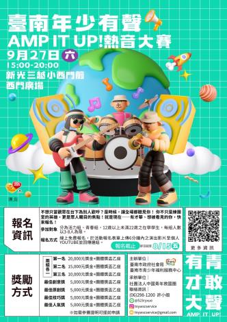 臺南年少有聲Amp it up!9月27日熱門音樂大賽x青少年創意市集,邀您一起展現自我&拿獎金,詳洽06-2981200。