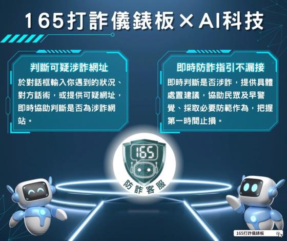 為因應詐騙手法快速演變,#內政部警政署 於「165打詐儀 錶板」導入AI智能客服小幫手 ,整合防詐資料庫提供即時 互動諮詢,可依民眾描述情境辨識詐騙風險並提供具體處 置建議;另具備涉詐網址即時查詢功能,可判斷網站是否 具詐騙風險。