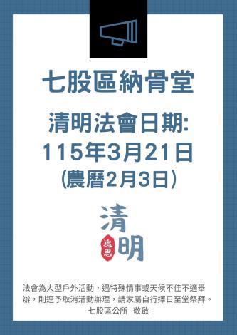 擇定115年3月21日(農曆2月3日)星期六上午8時至下午2時45分於本區納骨堂舉行清明法會。法會為大型戶外活動,為顧及工作人員及至堂祭祀之家屬健康及安全,遇特殊情事或天候不佳不適舉辦者(如疫情嚴峻、颱風、豪雨等天災),則逕予取消活動辦理,請家屬自行擇日至堂祭拜。請參與法會的民眾配合紙錢集中燒作業,金紙勿插香,在金紙放入運鈔車前確認移除香腳或其他易燃物,以免發生火警。相關最新公告訊息請至七股區公所網站最新消息 及 臺南市七股區公所 臉書查詢