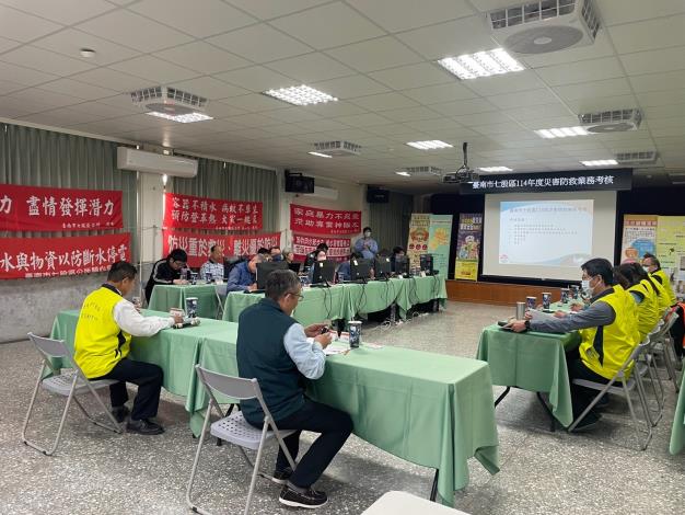 本年度災防業務考核,由市政府災害防救辦公室蔡國銓參議帶領災害防救辦公室、 民政局、 消防局、警察局、 社會局、 環保局、 衛生局、 水利局等局處考核官蒞臨本所,檢視本區災害防救業務辦理情形