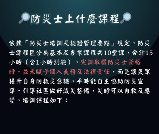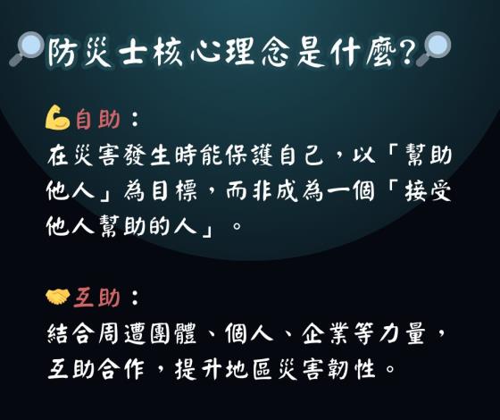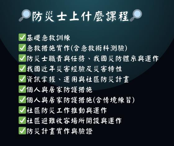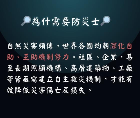 3.自主防救災措施均需有核心參與者來落實,並建立永續運作機制,希望藉由培育更多防災士,成為民間自主防救災工作之種子,協助推廣防救災工作!內政部消防署誠摯歡迎你(妳)加入防災士的行列,當災害來臨時,能夠保護自己,也幫助他人。