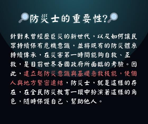1.針對未曾經歷巨災的新世代,以及如何讓民眾持續保有危機意識,並將既有的防災體系持續傳承,在災害第一時間能夠自救、互救,是目前世界各國政府所面臨的考驗。因此,建立起防災意識與基礎急救技能,使個人與地方緊密連結,防災士,就是這樣的存在,在全民防災教育一環中扮演著這樣的角色,隨時保護自己、幫助他人。