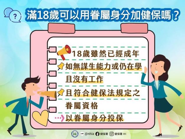 👋滿18歲如果無謀生能力或仍在就學沒有工作,還是應該以眷屬身分投保喔!