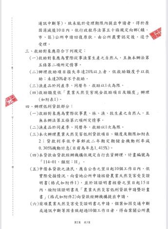 一、本次辦理現金救助及低利貸款地區及項目為臺南市「魚塭養殖全品項」。二、受理申請期間:自114年8月6日至8月19日止,於上班時間(上午8點至12點;下午1點至5點)至本所農業及建設課受理。三、所需文件:1.申請人印章(私章)。2.養殖漁業登記證影本(雙面)(影本)。3.水利建造物許可書(或水權證明) (影本)。4.本年度5月放養量申報書影本。5.申請人身分證影本。6.存摺影本。