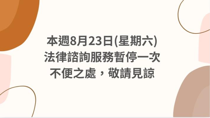本週8月23日(星期六)法律諮詢服務暫停一次,不便之處,敬請見諒。