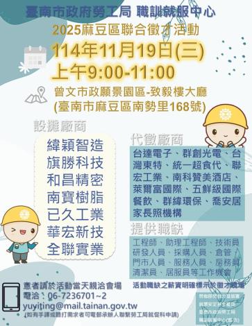 徵才活動時間如下:(一)徵才時間:114年11月19日(三)上午9至11時。(二)徵才地點:曾文市政願景園區致毅樓大廳(臺南市麻豆區南勢里168號)。(三)參加方式:歡迎求職者於活動當日著正式服裝親洽現場填寫履歷表,洽詢專線06-7236701~2,佳里就業服務台/尤小姐/林小姐。