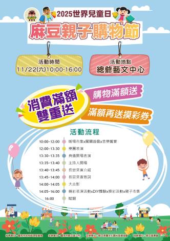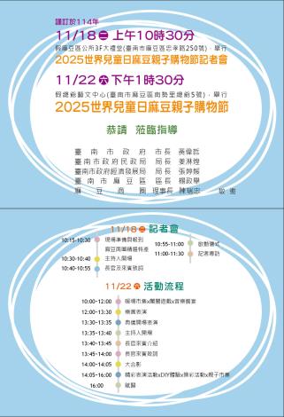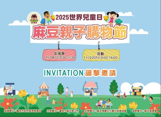 一、活動記者會:114年11月18日(二),上午10時,假本所三樓禮堂(臺南市麻豆區忠孝路250號)。二、2025年「世界兒童日」麻豆親子購物節:114年11月22日(六),上午10時至下午4時,假麻豆總爺藝文中心(臺南市麻豆區南勢里總爺5號)。