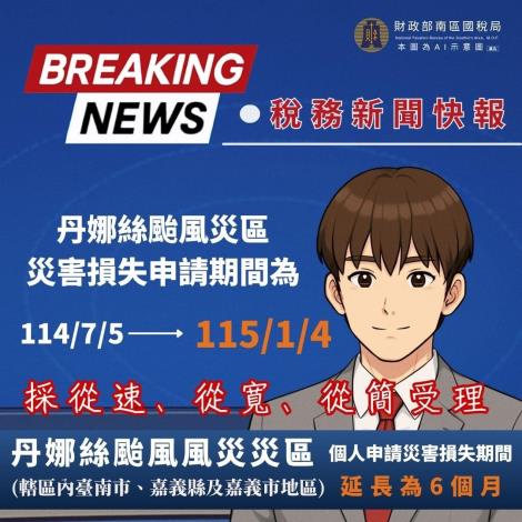 財政部南區國稅局表示,丹娜絲颱風重創臺灣南部,造成嚴重災情,為讓納稅義務人有充裕時間重建修復家園,該局將轄區內臺南市、嘉義縣及嘉義市地區之個人,申請災害損失期間由1個月延長為6個月(自114年7月5日起至115年1月4日止)。